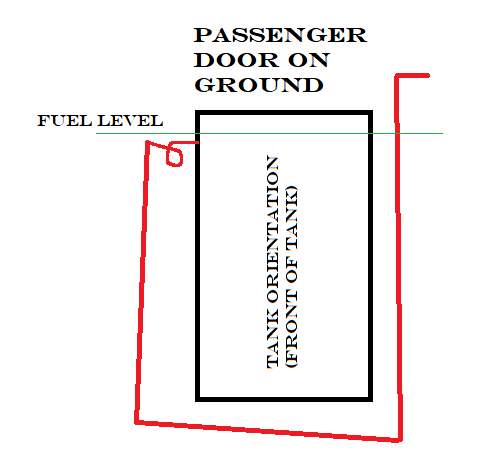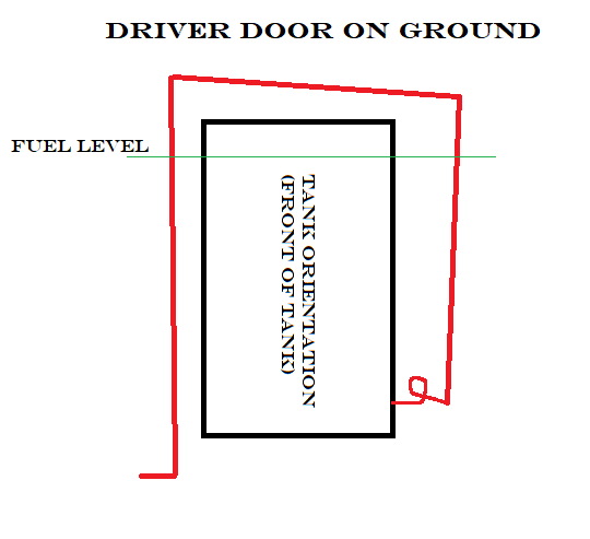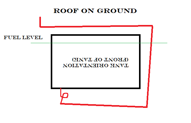 Now I can rotate the F4 set up and show how the fuel would get trapped in each scenario. I believe the most common rollover event to be getting blasted in the passenger side, rolling onto drivers door, and either staying there or continuing on over to the roof. Let’s look at those two possibilities first. By the way: It helps me to visualize it by thinking I’m looking at it from the front of the car.