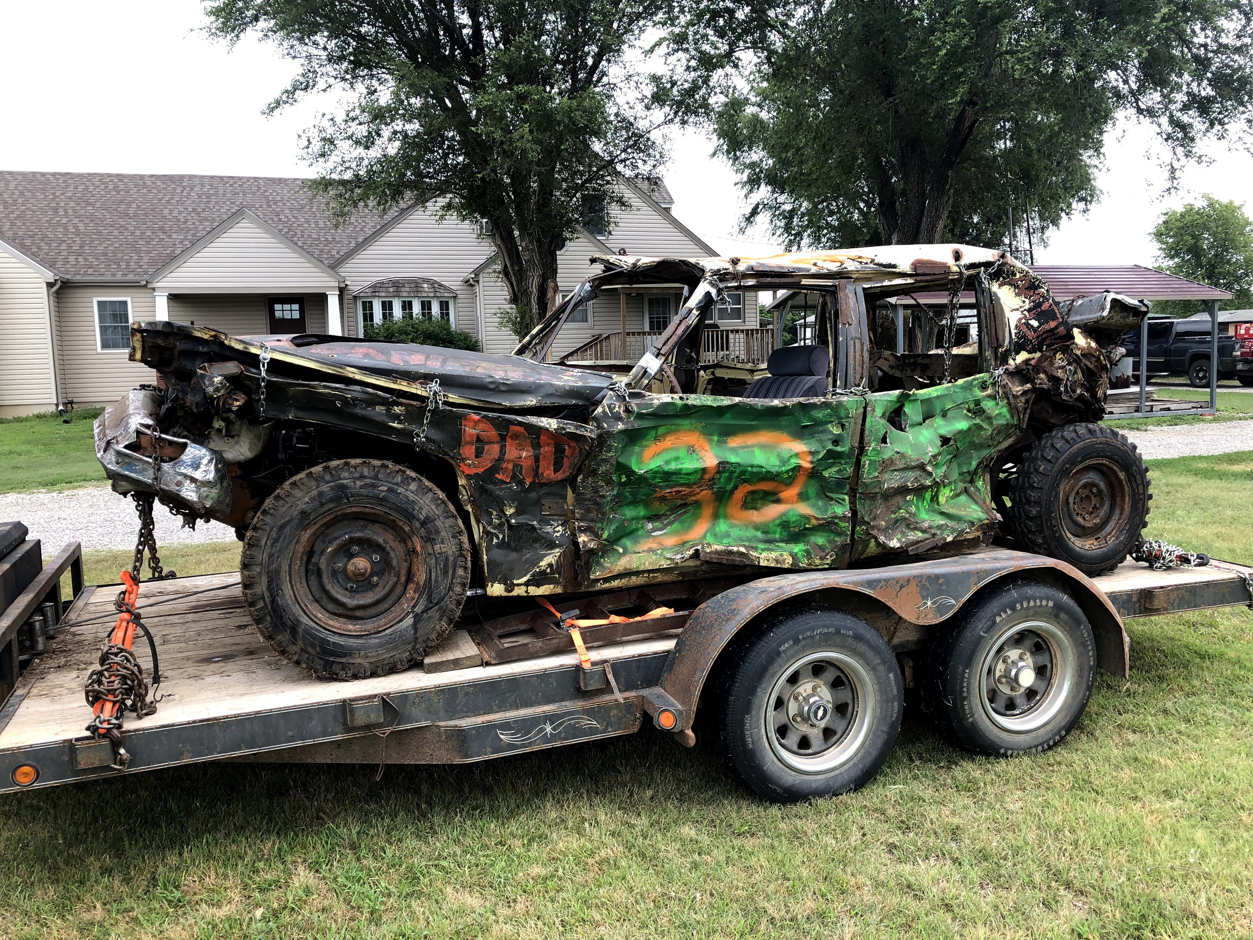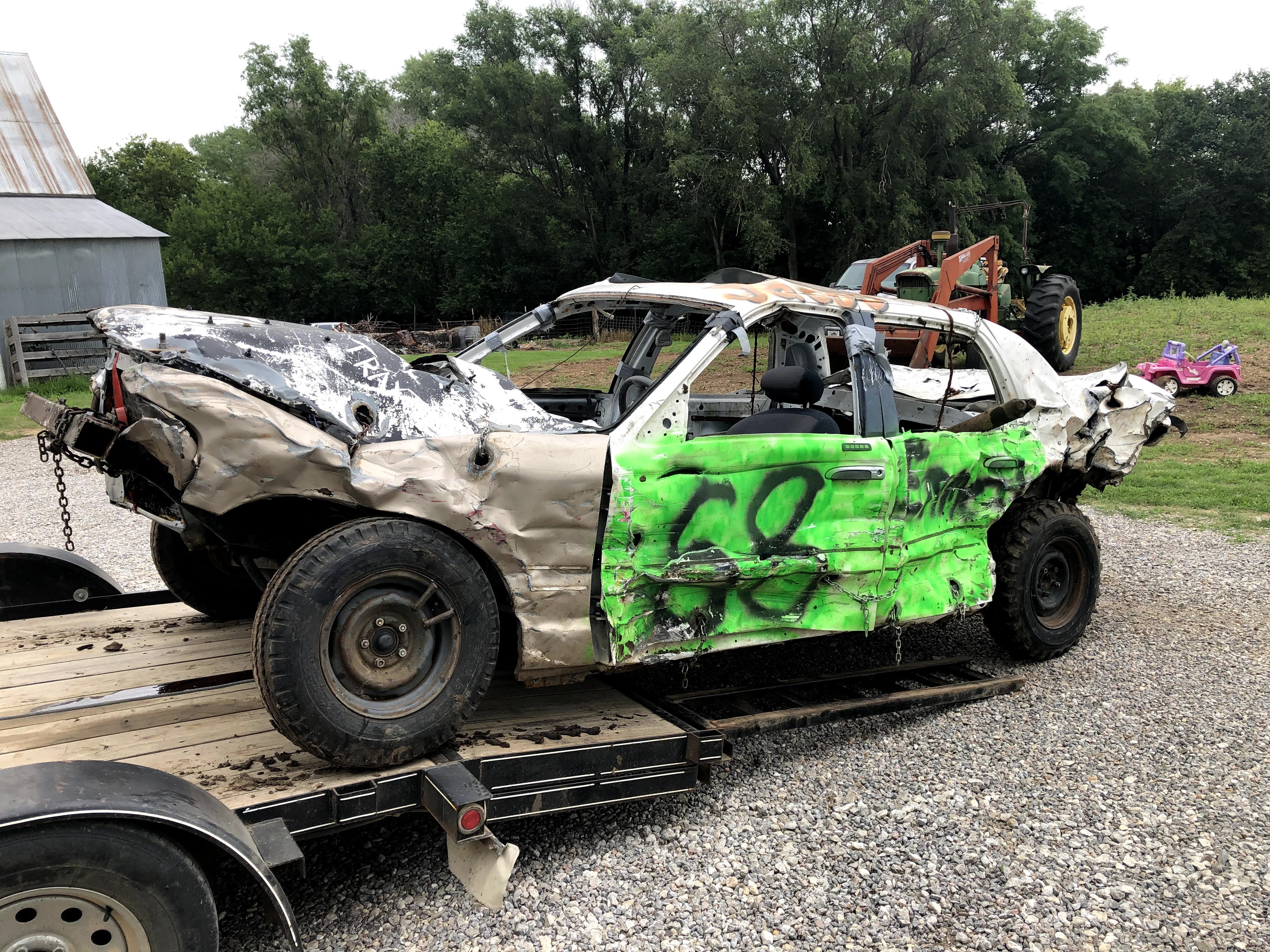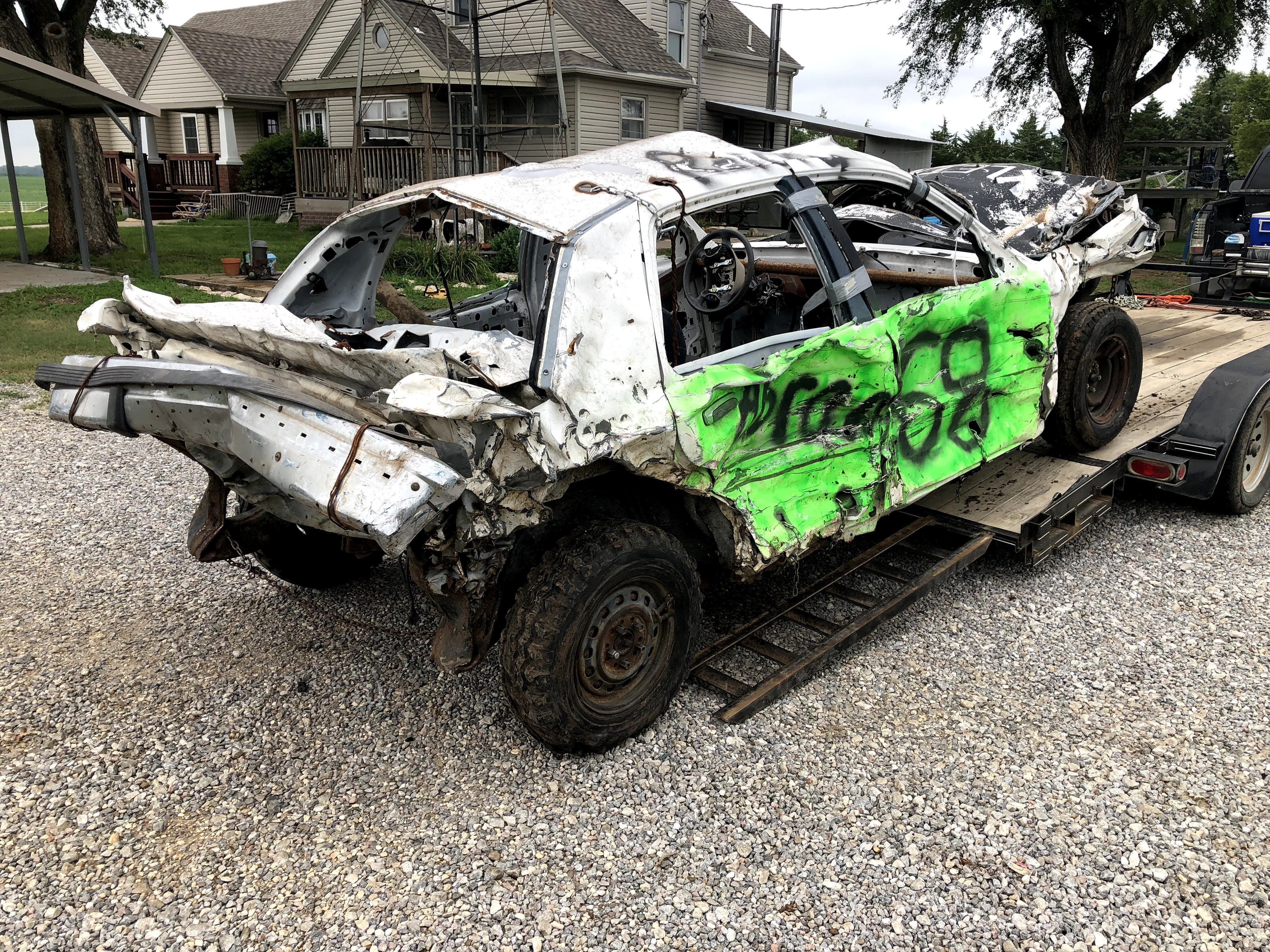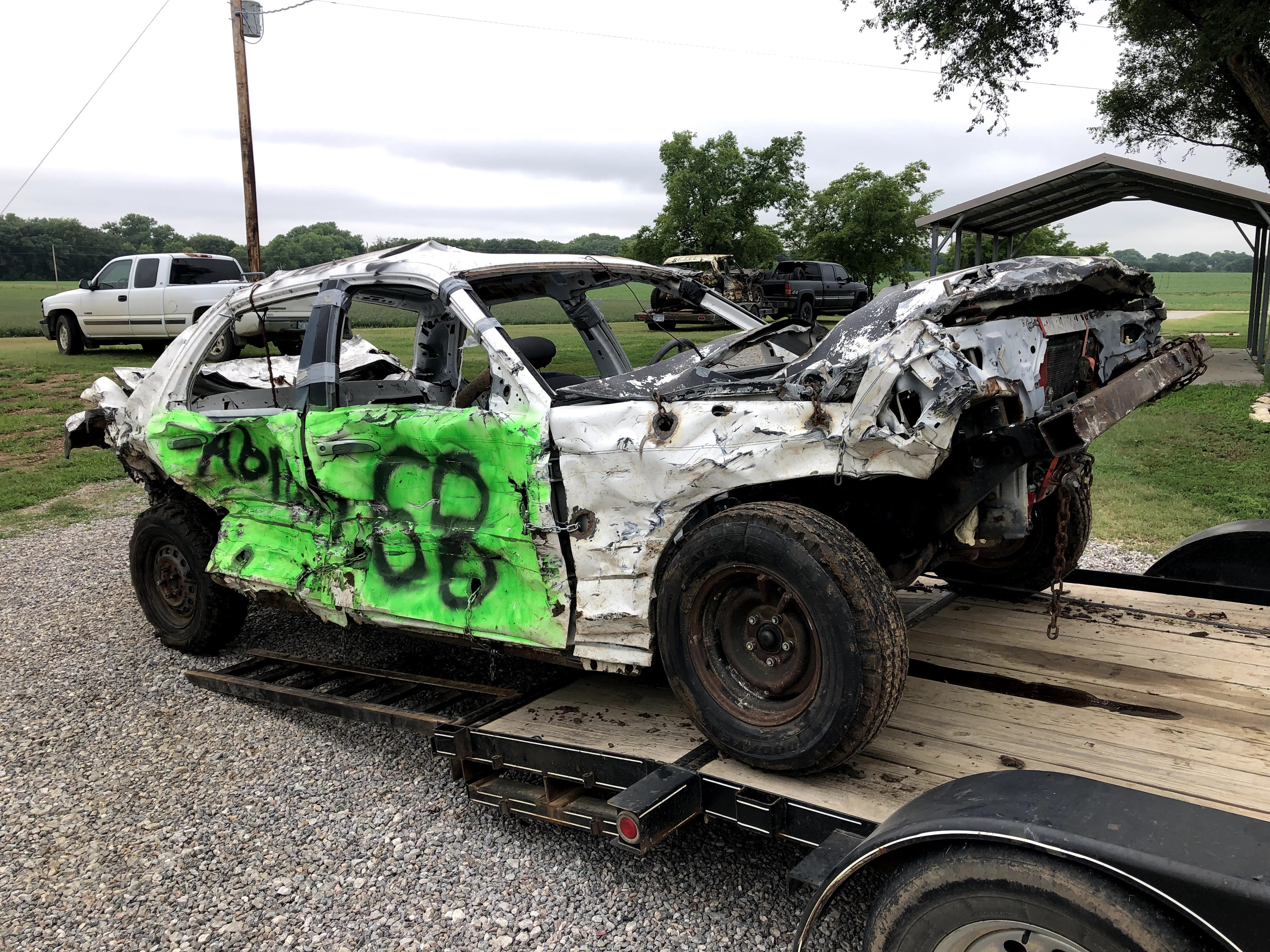In the first derby at Sylvan Grove I drove my pre-ran from last year, a 96 vic with a carbureted 87 (roller) 302 out of a Grand Marquis. I took a bad head on shot about 10 minutes in which took out my radiator, (my bumper was just a 3×3 tube and I had kicked the springs for height, but made my bumper sit too high. After that I took another hard shot to the front from another car that really nosed my car hard. Shortly after that, my driveshaft broke at the front u-joint. I learned that the ford driveshaft u-joints have a lot more clearance in one direction than the other, so grinding for additional clearance on the tight side is a good idea. Dad drove his 79 Cadi hard, and burnt up reverse in his transmission due to the fitting going into the radiator cooler leaking fluid. He insists the fittings were tight before the derby, but such is life. The car that got first broke his distributor cap on the last hit, and Dad couldn’t get backed up off the berm to make a winning hit. I have a Go-Pro video and after pics of these cars, but no before pictures.