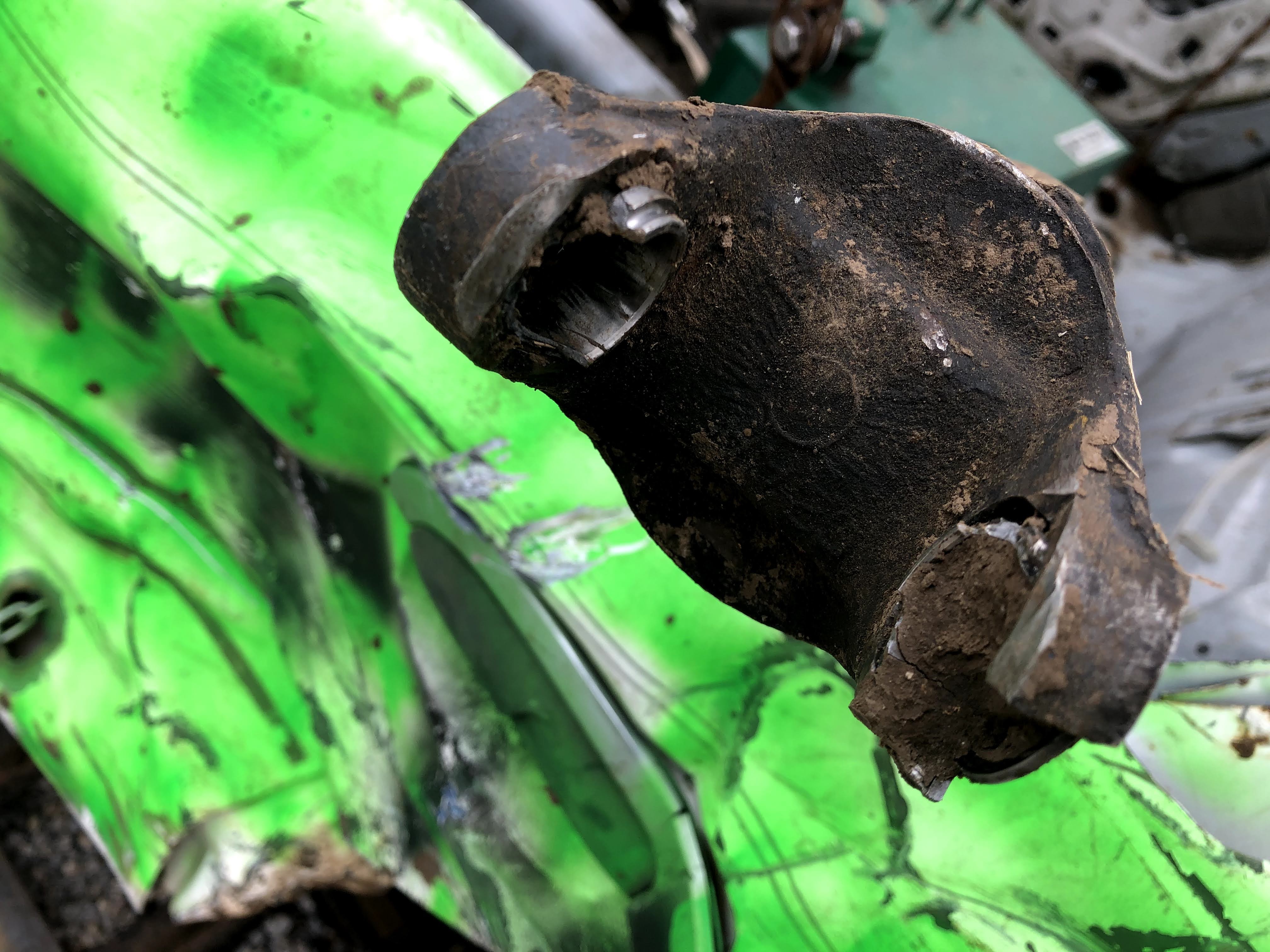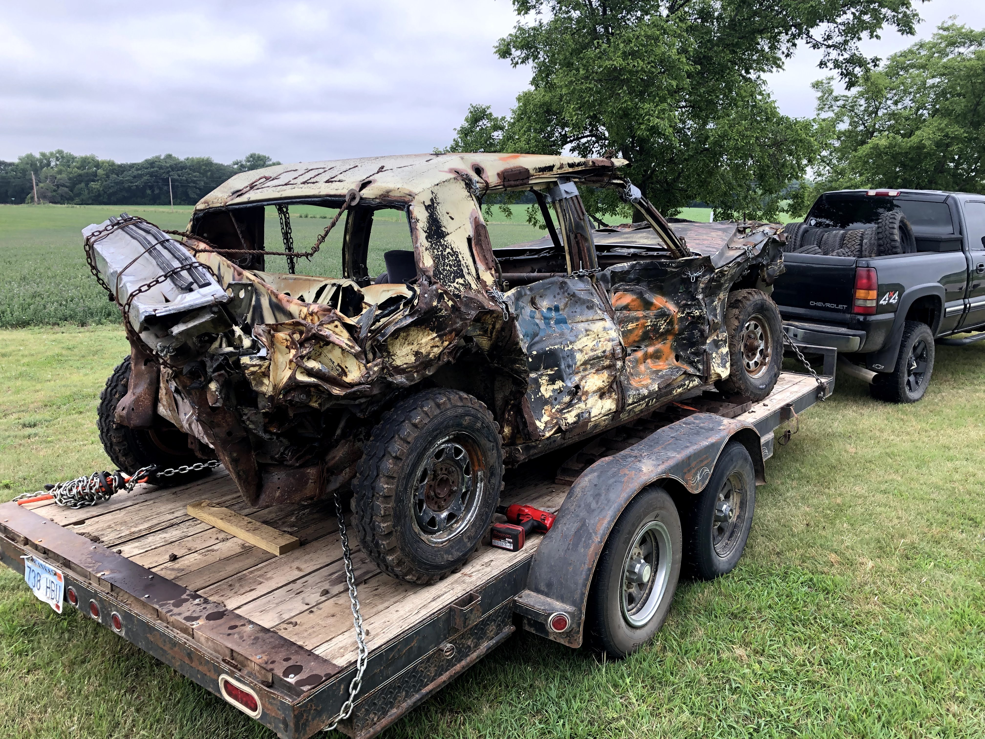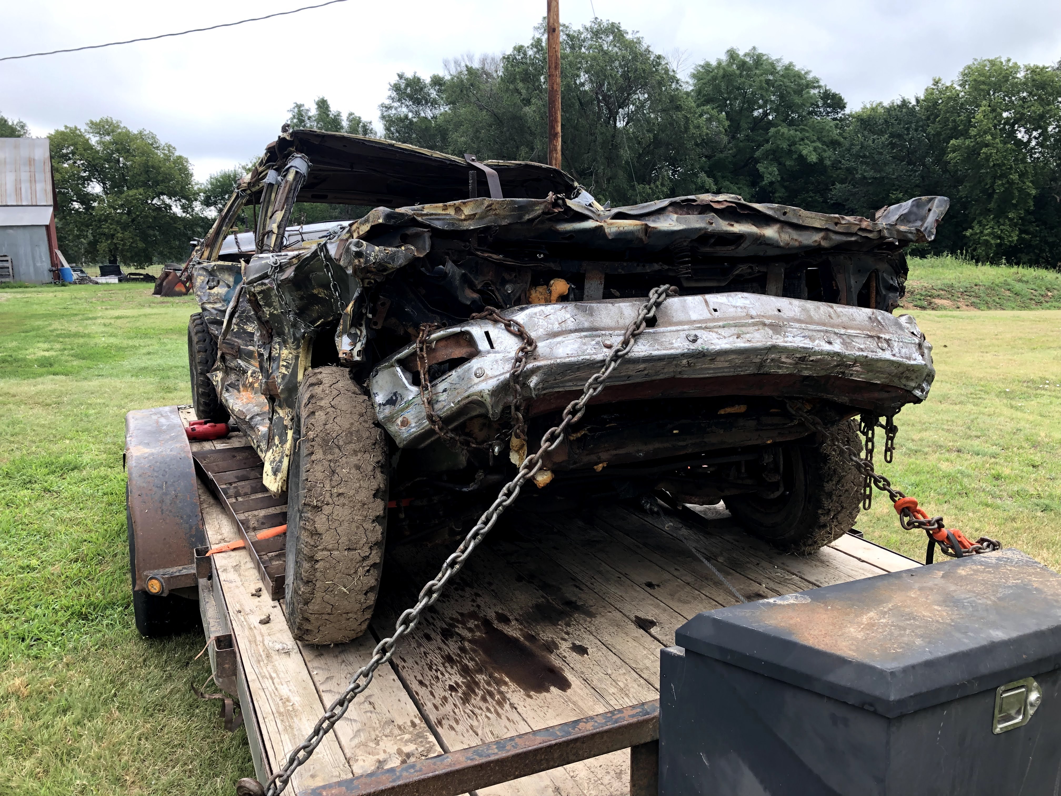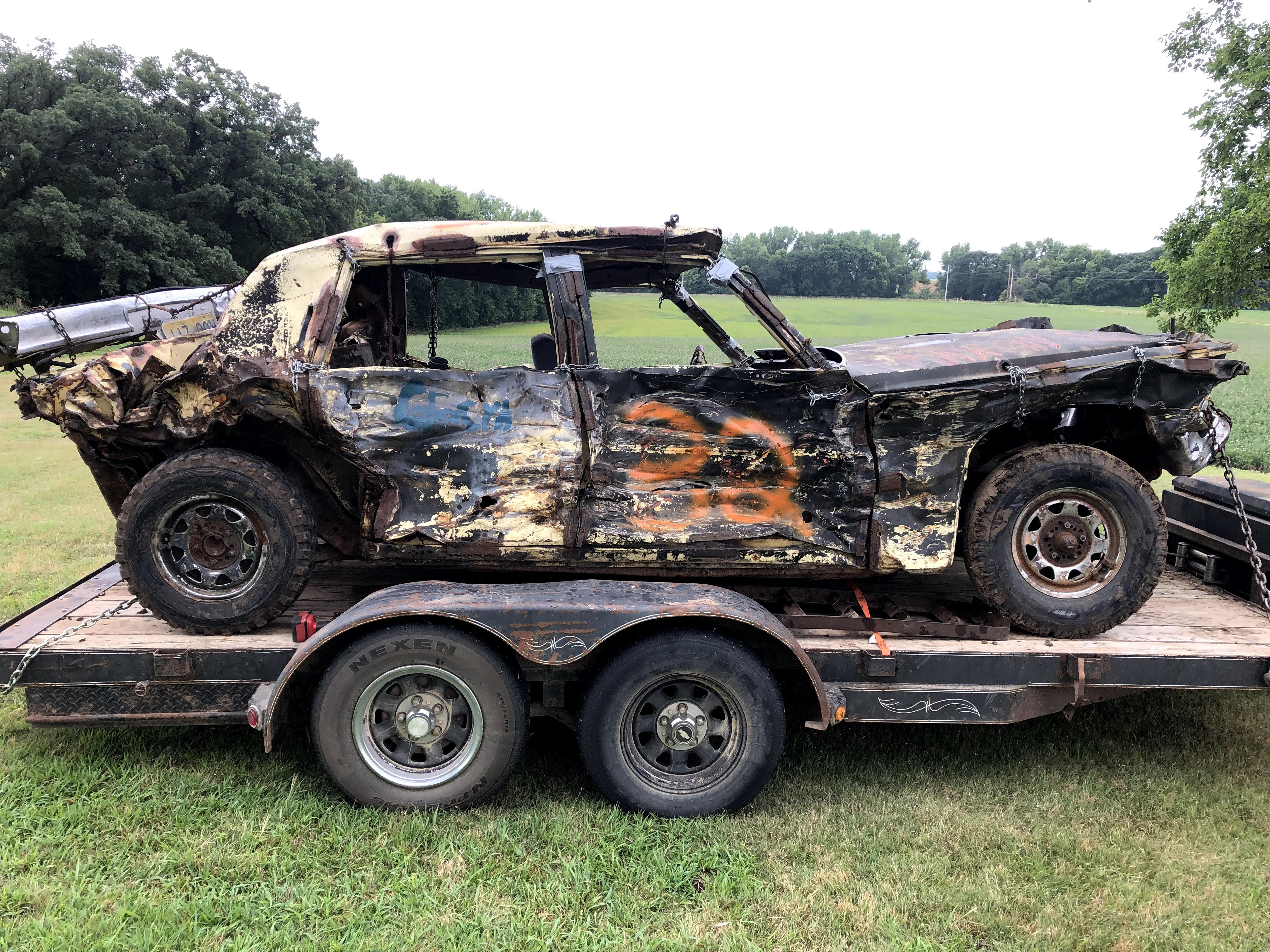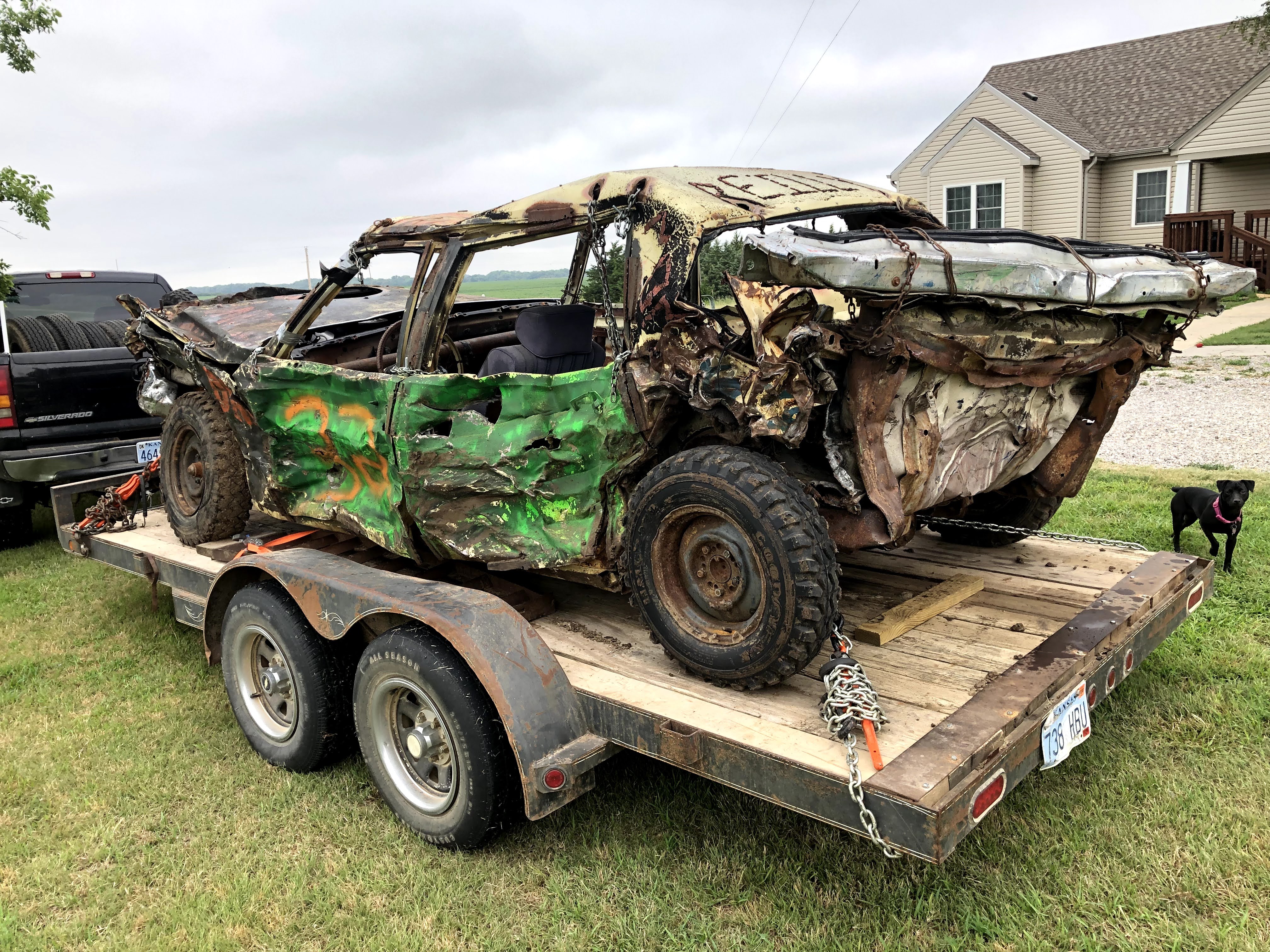 In the first derby at Sylvan Grove I drove my pre-ran from last year, a 96 vic with a carbureted 87 (roller) 302 out of a Grand Marquis. I took a bad head on shot about 10 minutes in which took out my radiator, (my bumper was just a 3×3 tube and I had kicked the springs for height, but made my bumper sit too high. After that I took another hard shot to the front from another car that really nosed my car hard. Shortly after that, my driveshaft broke at the front u-joint. I learned that the ford driveshaft u-joints have a lot more clearance in one direction than the other, so grinding for additional clearance on the tight side is a good idea. Dad drove his 79 Cadi hard, and burnt up reverse in his transmission due to the fitting going into the radiator cooler leaking fluid. He insists the fittings were tight before the derby, but such is life. The car that got first broke his distributor cap on the last hit, and Dad couldn’t get backed up off the berm to make a winning hit. I have a Go-Pro video and after pics of these cars, but no before pictures.